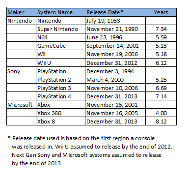 Here’s a quick look at the release schedule for the current three console makers. Nintendo, being the oldest player in the industry, has the most data (sorry folks, didn’t make a bar graph for you guys, so you’ll have to deal with a table instead of a picture representation). Sony and Microsoft’s next console, assuming they release in Q4 2013 will be the longest time between consoles since the original Nintendo and Super Nintendo systems, which came in at 7.34 years.